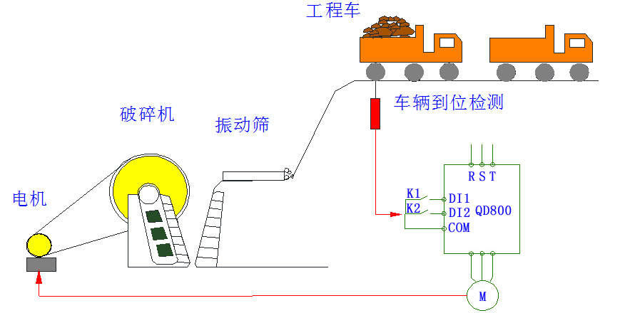 選擇QD800變頻器,破碎石料運行50HZ,空載運行30HZ;運料車工程車卸貨處安裝位置檢測開關(guān),運料車到位輸出信號給變頻器,變頻器加速到50HZ,運料車離開經(jīng)過1.5分鐘結(jié)束破碎,變頻器減速到30HZ運行,周而復(fù)始。設(shè)置兩段加減速時間:第一段加速從0HZ到30HZ,設(shè)置加速30秒;第二段30HZ到50HZ加速20秒,從50HZ到30HZ,減速時間40秒。