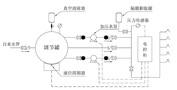 其主要工作原理是:自來水管網(wǎng)的水直接進(jìn)入調(diào)節(jié)罐,罐內(nèi)的空氣從真空消除器內(nèi)排出,待水充滿后,真空消除器自動關(guān)閉。當(dāng)自來水能夠滿足用水壓力及水量要求時(shí),設(shè)備通過旁通止回閥向用水管網(wǎng)直接供水;當(dāng)自來水管網(wǎng)的壓力不能滿足用水要求時(shí),系統(tǒng)通過壓力傳感器給出啟泵信號啟動水泵運(yùn)行。