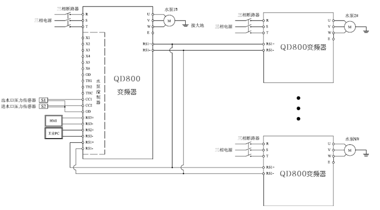 無負(fù)壓恒壓供水方式是在恒壓供水設(shè)備上發(fā)展起來的,利用原有自來水管網(wǎng)壓力進(jìn)行高效節(jié)能供水的一種二次加壓方式。因此,其對系統(tǒng)的自動化控制水平及穩(wěn)定性提出了更高要求。本文擬介紹一種基于奧卓QD800無負(fù)壓恒壓供水專用變頻器的系統(tǒng)控制方案,系統(tǒng)包含了無負(fù)壓恒壓供水控制器單元和變頻驅(qū)動單元,可配置靈活最多6臺水泵供水控制,操作簡單,供水壓力穩(wěn)定,具有極高的自動化程度及可靠性。還可組成具有無線遠(yuǎn)程和現(xiàn)場雙通道監(jiān)控的便捷、高效的監(jiān)控系統(tǒng)。