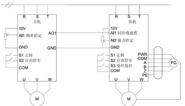 1. 主機(jī)和從機(jī)運(yùn)行在閉環(huán)矢量模式下,其中從機(jī)還由變頻器的卷繞宏進(jìn)行自帶卷徑計(jì)算的開環(huán)張力轉(zhuǎn)矩控制。