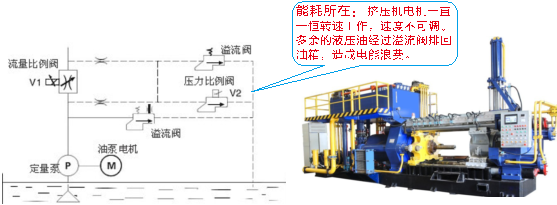 鋁型材擠出機(jī)節(jié)能 擠出機(jī)工作過(guò)程一般分為上料、頂緊、擠壓、退后、切斷、等幾個(gè)階段,各階段需要的流量和壓力都不同,其中擠壓的時(shí)間較長(zhǎng)(90%),耗能較多(90%),其速度和壓力是靠流量比例閥和壓力比例閥來(lái)調(diào)節(jié),通過(guò)調(diào)節(jié)流量比例閥和壓力比例閥的開(kāi)啟度來(lái)控制流量和壓力大小。對(duì)于油泵馬達(dá)而言,是長(zhǎng)期處于全速工作狀態(tài);擠壓過(guò)程是處于變化的負(fù)載狀態(tài),在擠出機(jī)的液壓系統(tǒng)中,油泵提供變化的流量,但電機(jī)還是恒定轉(zhuǎn)速不變的,還是有多余的液壓油通過(guò)溢流閥回流到油箱,此過(guò)程稱為高壓節(jié)流。能量損失高達(dá)15%~35%。因油泵的供油量與電機(jī)的轉(zhuǎn)速成正比,因此我們可以通過(guò)調(diào)節(jié)油泵的供油量與擠出機(jī)的實(shí)際流量需求相一致,消除溢流現(xiàn)象,以達(dá)到節(jié)能的目的。