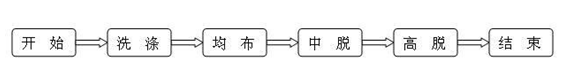 首先加水、正反轉洗滌25分鐘、洗滌完畢后排水、進入脫水階段,脫水階段包括均布、中脫和高脫三個過程,均布即是在有水和無水的情況下,以比洗滌過程高的轉速正向旋轉1.5分鐘,使衣物均勻地附著在洗衣機的滾筒內側,以使后續(xù)的脫水過程平穩(wěn);排水后,提高轉速進入中速脫水過程(2分鐘),隨后再進入高速脫水過程(5分鐘),使衣物的含水率降至所要求的水平。其工作流程圖如下圖所示: