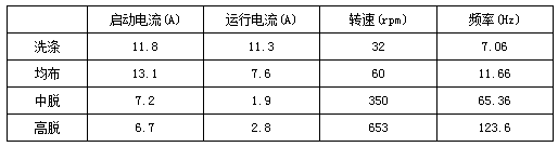 經(jīng)過在100kg型洗衣機上的試驗(變頻器為QD600-3011G,11kW),得出數(shù)據(jù)如下: