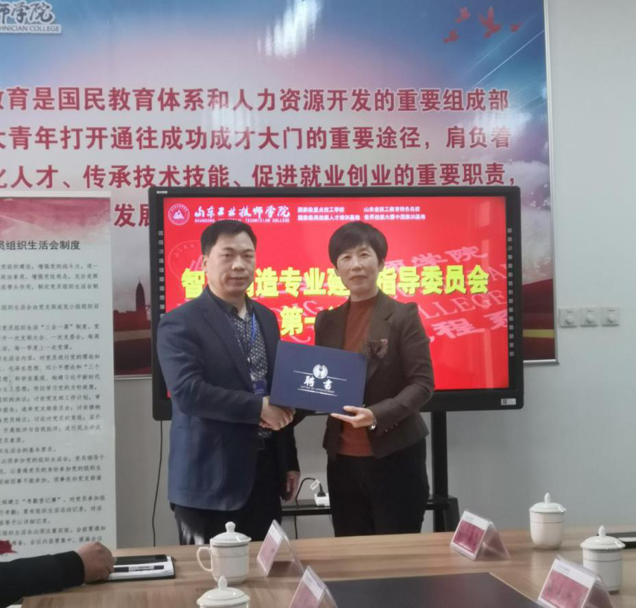 本次大會山東工業(yè)技師學院還聯(lián)合西門子(中國)有限公司、費斯托(中國)有限公司、GF加工方案、山東奧卓電氣科技發(fā)展有限公司等部分知名企業(yè),成立了智能制造專業(yè)建設指導委員會。工作人員宣讀了《智能制造專業(yè)建設指導委員會章程》和委員會主任委員、副主任委員、委員名單,公司總經(jīng)理張慶平代表山東奧卓電氣科技發(fā)展有限公司被聘任為智能制造專業(yè)建設指導委員會副主任委員。