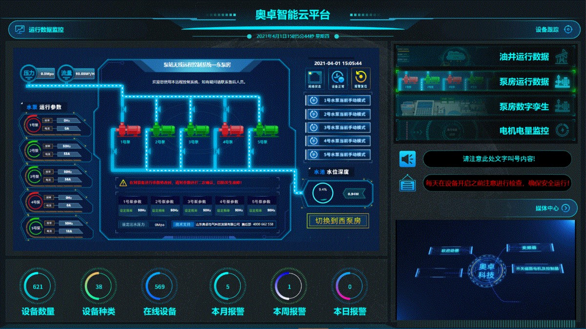 作為服務(wù)化、信息化、自動(dòng)化的核心產(chǎn)品,奧卓云平臺(tái)在2020年10月份正式上線(xiàn),奧卓科技產(chǎn)品在接入該平臺(tái)后可實(shí)時(shí)顯示設(shè)備運(yùn)行狀況、運(yùn)行參數(shù)、報(bào)警狀態(tài)等信息,可隨時(shí)在手機(jī)端或電腦端對(duì)設(shè)備參數(shù)進(jìn)行更改,在報(bào)警后會(huì)把故障信息,可能故障原因等通過(guò)電話(huà)語(yǔ)音、短信、微信、郵箱4個(gè)方式快速通知維修人員。