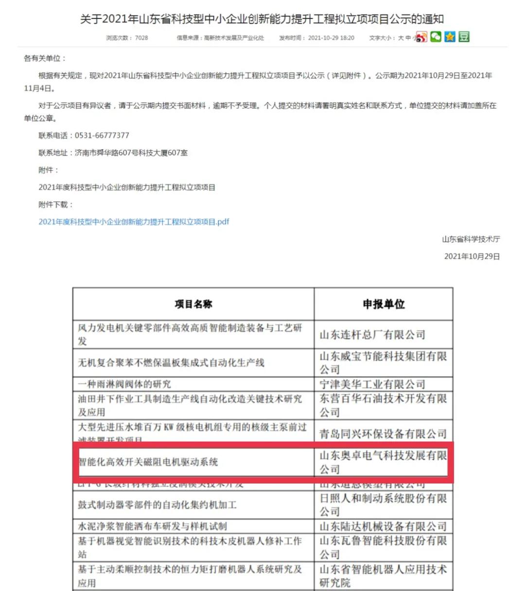 2021年11月4日,經(jīng)過山東省科學(xué)技術(shù)廳“關(guān)于2021年山東省科技型中小企業(yè)創(chuàng)新能力提升工程擬立項(xiàng)項(xiàng)目公示的通知”的公示,山東奧卓電氣科技發(fā)展有限公司的“智能化高效開關(guān)磁阻電機(jī)驅(qū)動(dòng)系統(tǒng)”項(xiàng)目成功入選2021年山東省科技型中小企業(yè)創(chuàng)新能力提升工程。